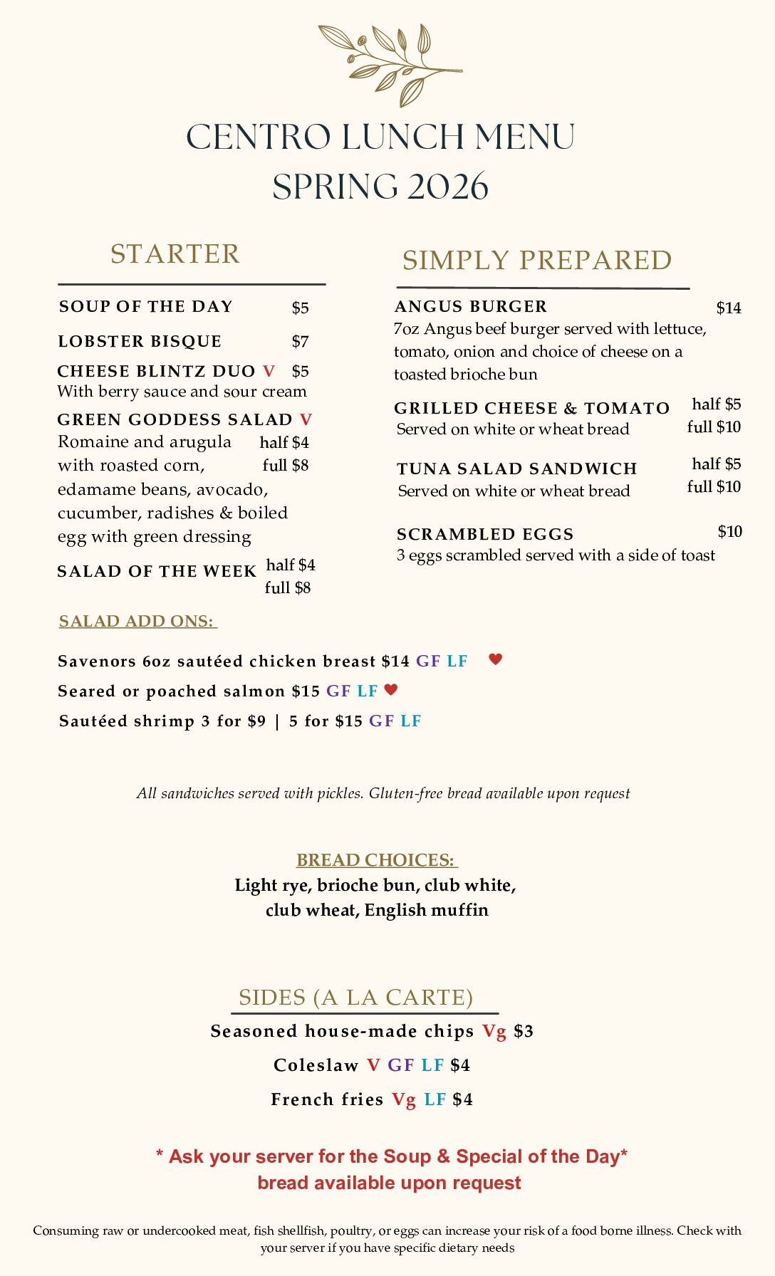 Centro Lunch Menu