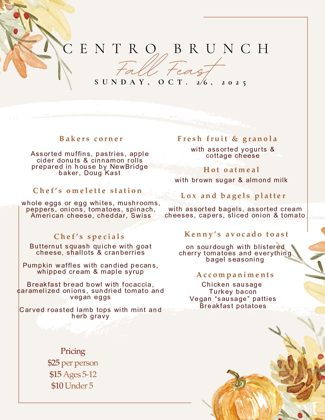 Joins us for the next Centro Sunday Brunch from 11am to 2pm Use open table or contact Centro beginning Monday the week prior for reservations Family & Friends are welcome to join