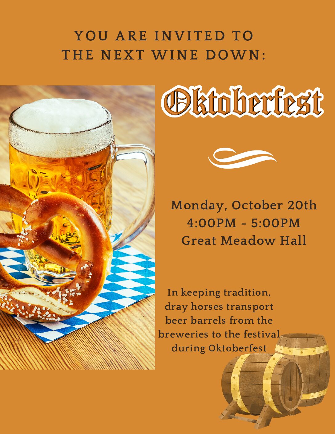 ![]() Join us for an Oktoberfest in Great Meadow Hall and help us celebrate Fall with some Oktoberfest fare and libation! |