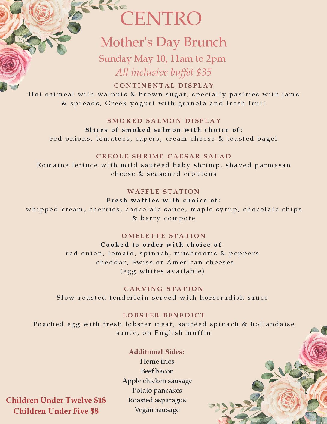 Joins us for the next Centro Sunday Brunch from 11am to 2pm Reservations open 1 week in advance Reserve through open table on the dining website or by contacting Centro directly @ x-49100 or in person at the host stand Family & Friends are welcome...